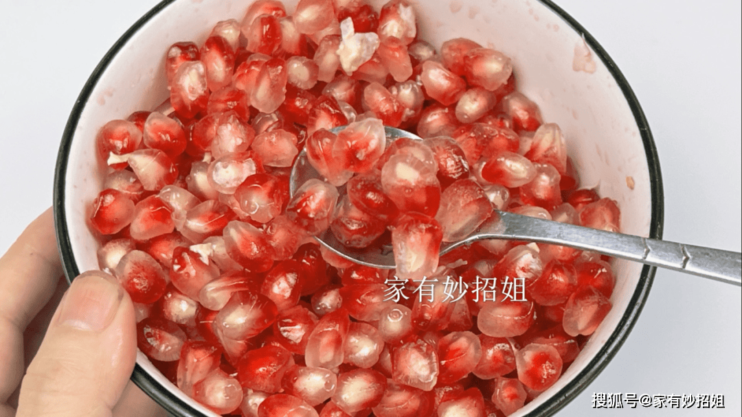 經過反覆的敲打我們就可以看到,石榴殼裡面的石榴籽就都被敲打了下來,非常乾淨,沒有一點浪費,所有的石榴籽都掉落在了碗裡。這樣我們吃起來可就過癮多了,隨便抓上一把或是用湯匙舀著吃都可以。這個剝石榴的方法簡單又快速,而且還不流汁不浪費,下次吃石榴,你也可以試試看。