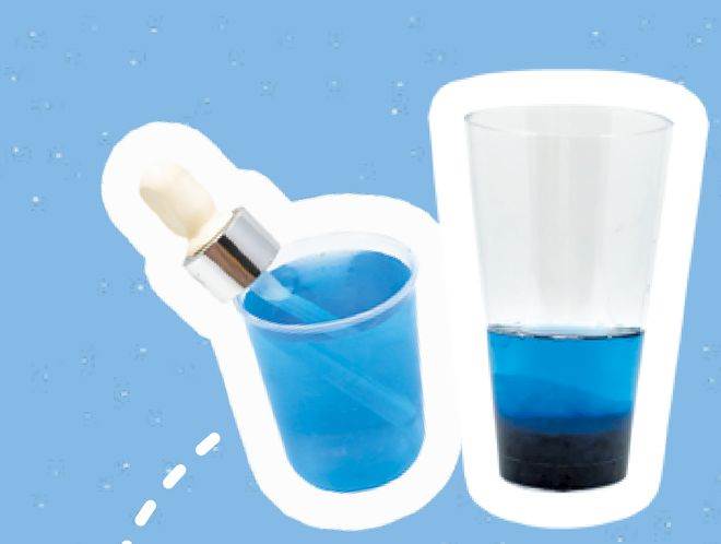 同樣是拿一個杯子來打比方。用一個透明的量杯,在里面放入100毫升的清水 ,并且滴入 8到10滴的藍色色素 和一勺食鹽。