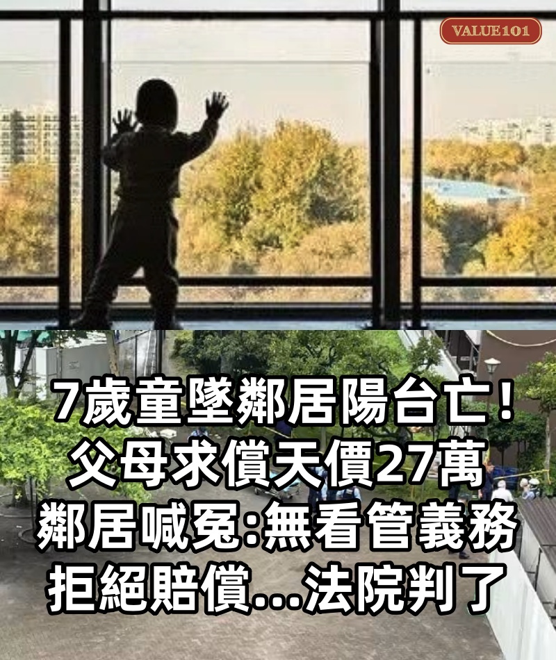 7歲童墜鄰居陽台亡!!父母求償天價27萬,鄰居喊冤「無看管義務」拒絕賠償...法院判了