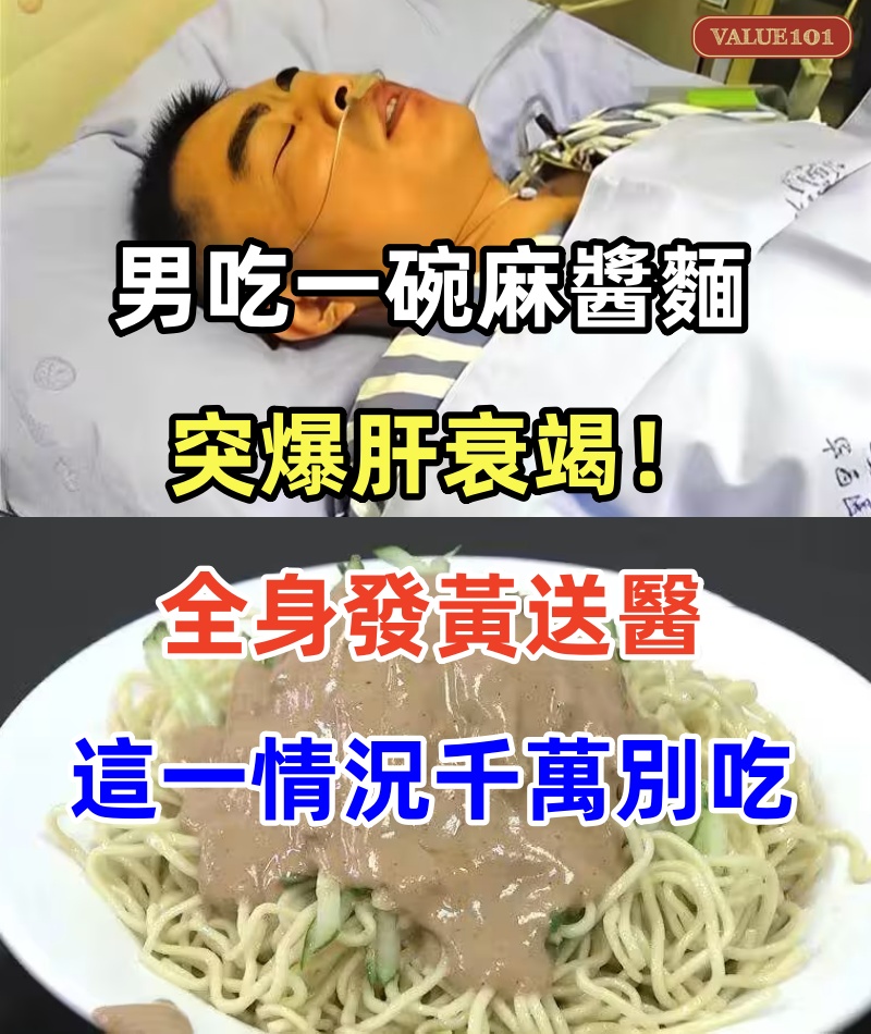 40歲男「吃一碗麻醬麵」突爆肝衰竭!全身發黃送醫,這一情況千萬別吃
