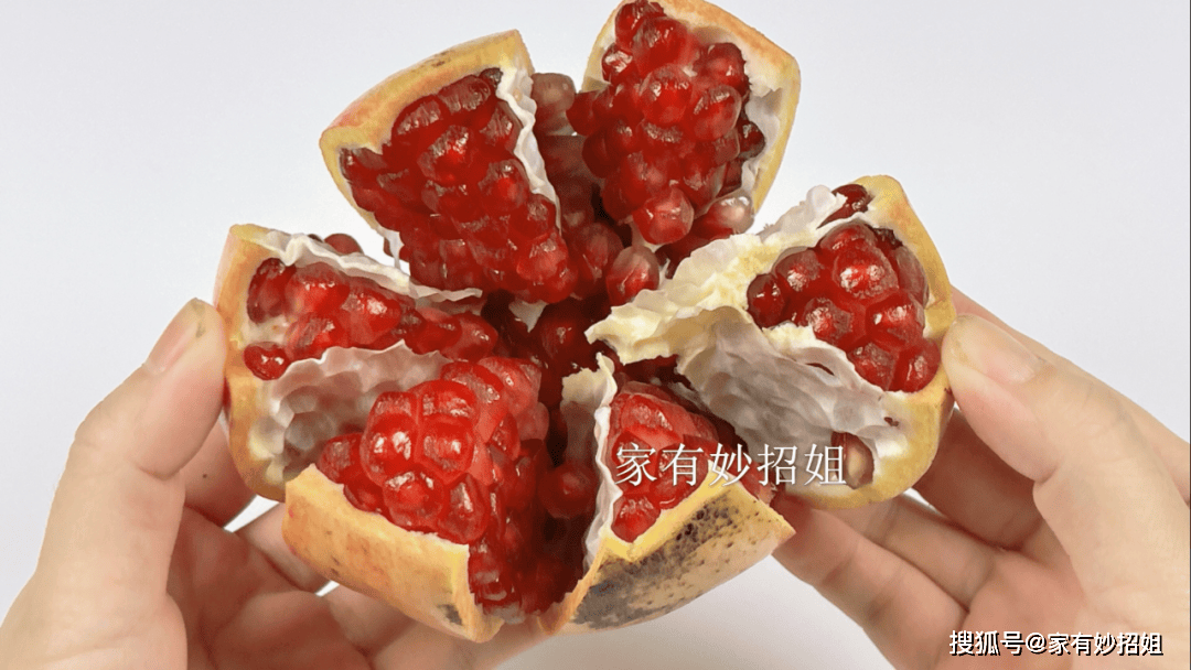 全部切好,石榴籽就被我們分成了幾部分,接下來我們將石榴掰一掰,把切開的幾瓣石榴給它掰鬆一點,這樣整個石榴裡面的果實就完全暴露了。對於那些將石榴籽隔開的白色筋膜,我們可以直接把它撕下來不要。