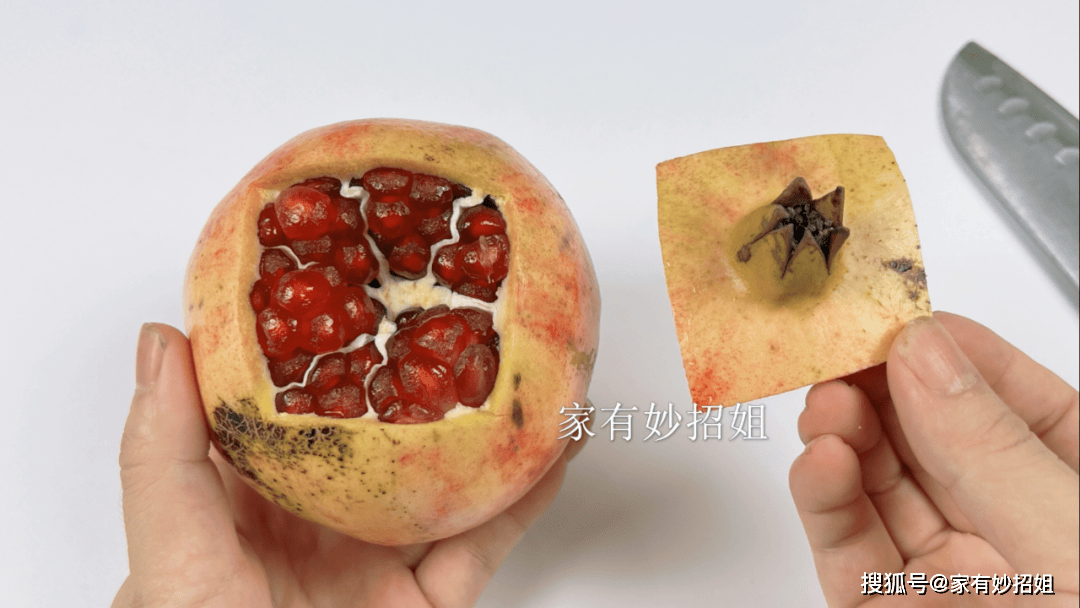 切好後,我們再用小刀的尖頭一挑,這塊石榴皮就被取了下來。