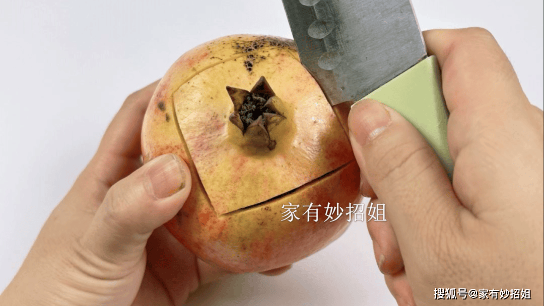 其實想要快速的把裡面的石榴籽剝出來,具體的方法也很簡單,我們先將石榴抓在手上,然後找到石榴帶有一朵小花的一端。接著拿水果刀沿著花朵的四周分別切上一刀,把它切成一個小正方形的樣子,我們不需要切太深,把表皮給它切破就可以了。