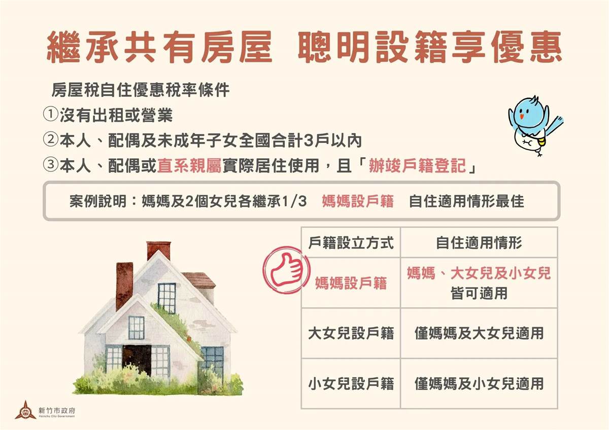 依規定,自住房屋須有本人、配偶或直系親屬「辦竣戶籍登記」,因此,稅務局也建議王媽媽,可以將自己的戶籍遷入繼承的金山街房屋,而小女兒的戶籍遷至其光復路房屋,如此一來,3戶房屋都可享有自住優惠稅率。 (相關報導: 家人名下有房注意!忘做1件事「140萬元重稅找上門」,國稅局教3招合法節稅 | 更多文章 )