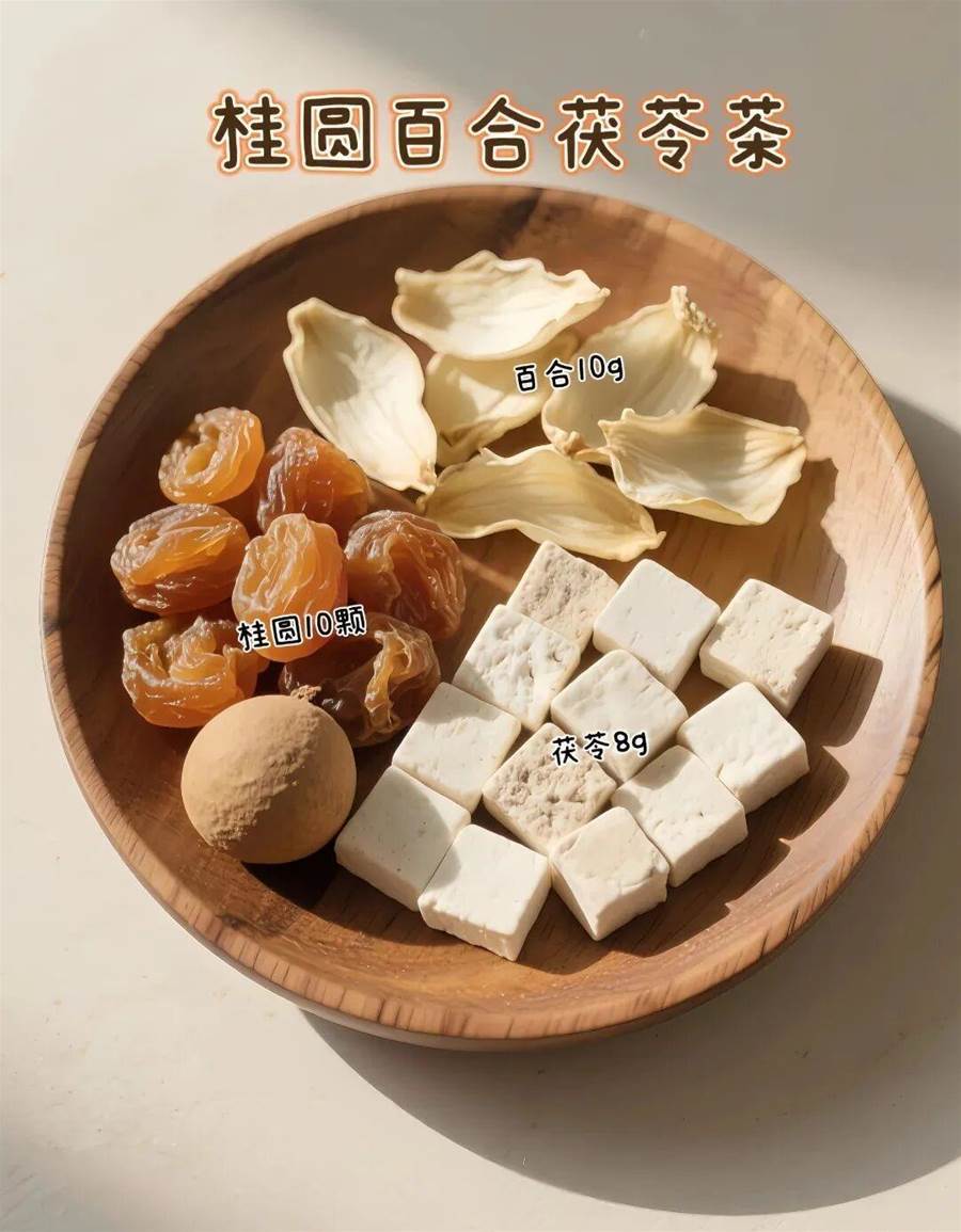 食材 :桂圓10顆 + 干百合10g + 茯苓8g
