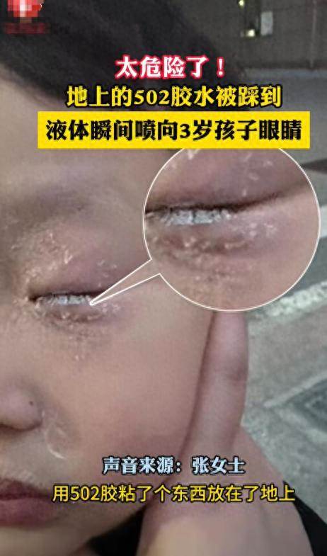 當膠水噴進孩子眼睛的那一刻,孩子本能地閉上了眼睛,但膠水還是濺到了整個眼瞼。